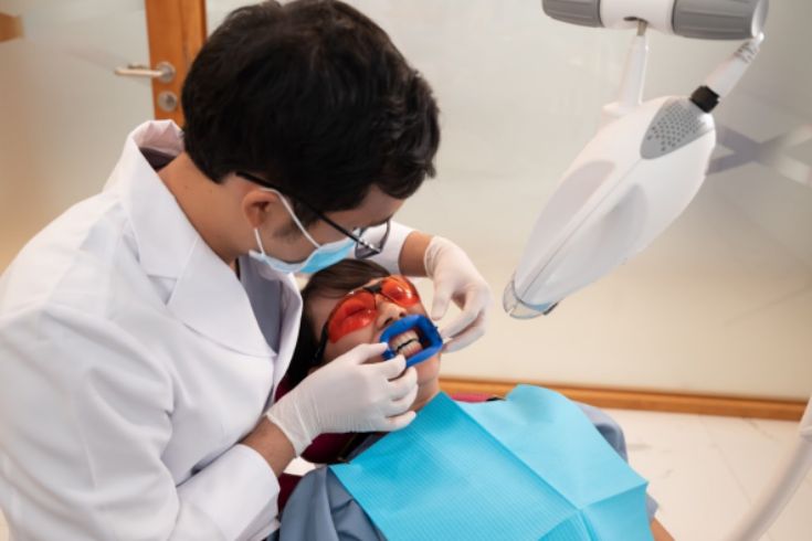 - Chiếu đèn kích hoạt: Nha sĩ sẽ sử dụng đèn Laser hoặc Plasma chiếu trực tiếp lên răng. Năng lượng ánh sáng sẽ kích hoạt các phân tử trong thuốc, đẩy nhanh phản ứng phá vỡ các chuỗi protein màu trong ngà răng. Quá trình này có thể được lặp lại 2-3 lần, mỗi lần khoảng 15-20 phút.