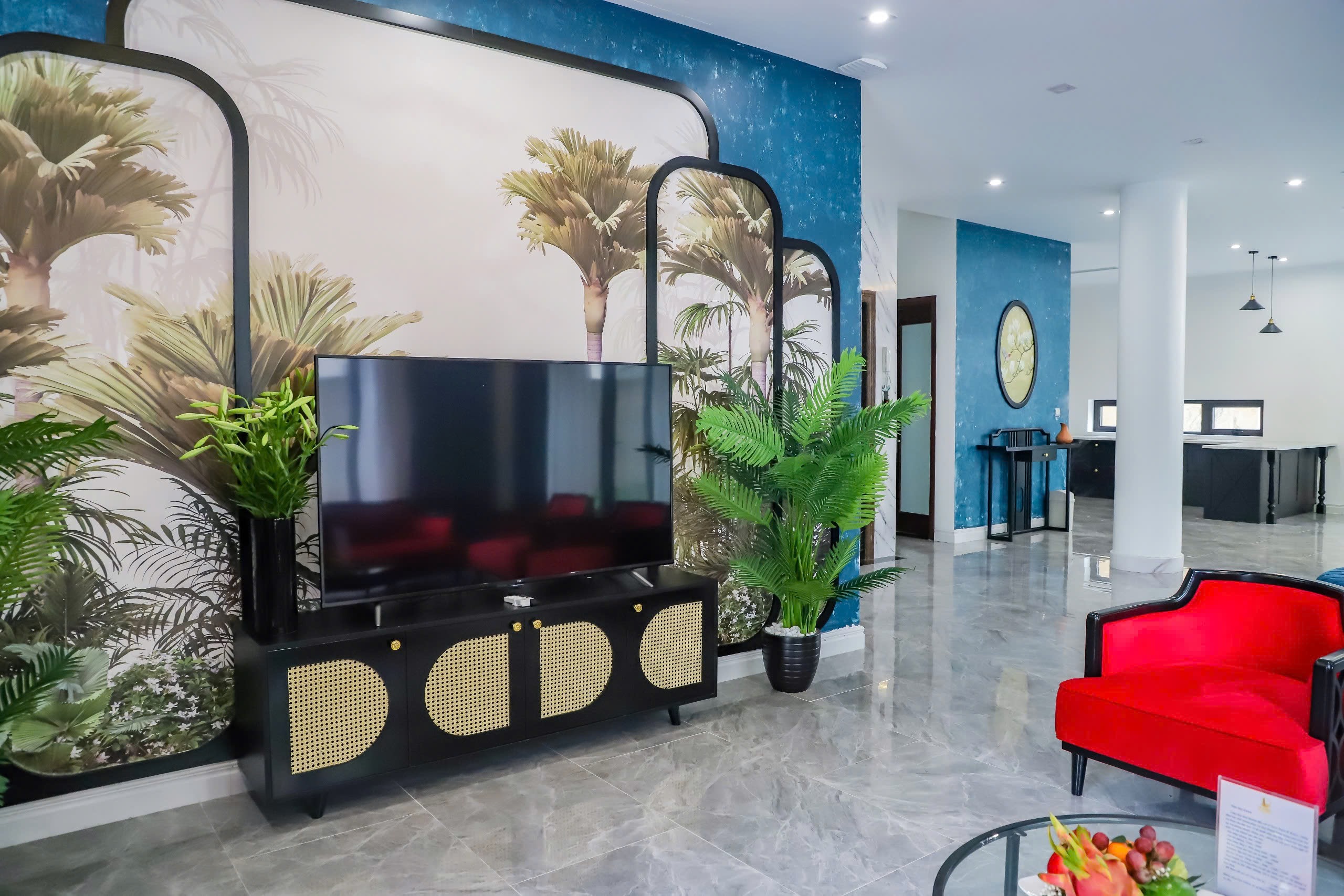 Phòng khách tại tầng trệt được thiết kế mở, ngập tràn ánh sáng tự nhiên. Bộ sofa êm ái, sang trọng là nơi lý tưởng để cả đoàn cùng nhau trò chuyện, xem phim hay đơn giản là thả mình thư giãn sau một ngày dài khám phá. Mọi chi tiết nội thất đều được chăm chút tỉ mỉ, toát lên vẻ đẹp hiện đại nhưng không kém phần ấm cúng.