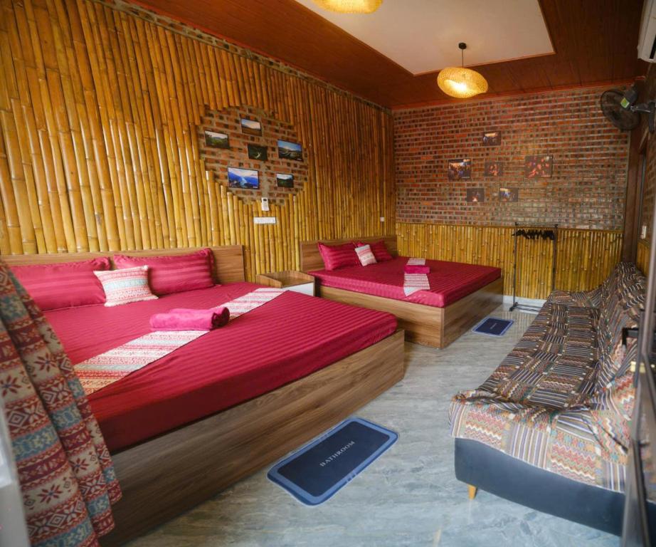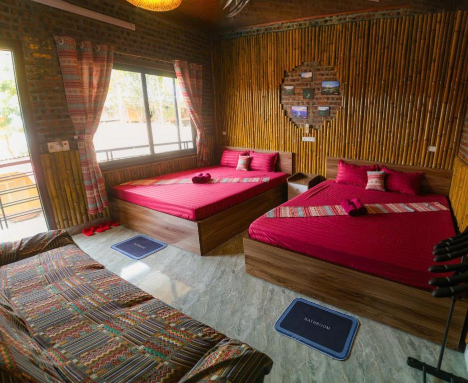 Phòng Deluxe 2 Giường được thiết kế với sức chứa tiêu chuẩn cho 4 người và tối đa 6 người, rất phù hợp cho gia đình hoặc nhóm bạn bè. Với không gian rộng rãi, phòng mang đến cảm giác thoải mái và ấm cúng, giúp bạn dễ dàng thư giãn sau những ngày dài khám phá vẻ đẹp của Mai Châu.