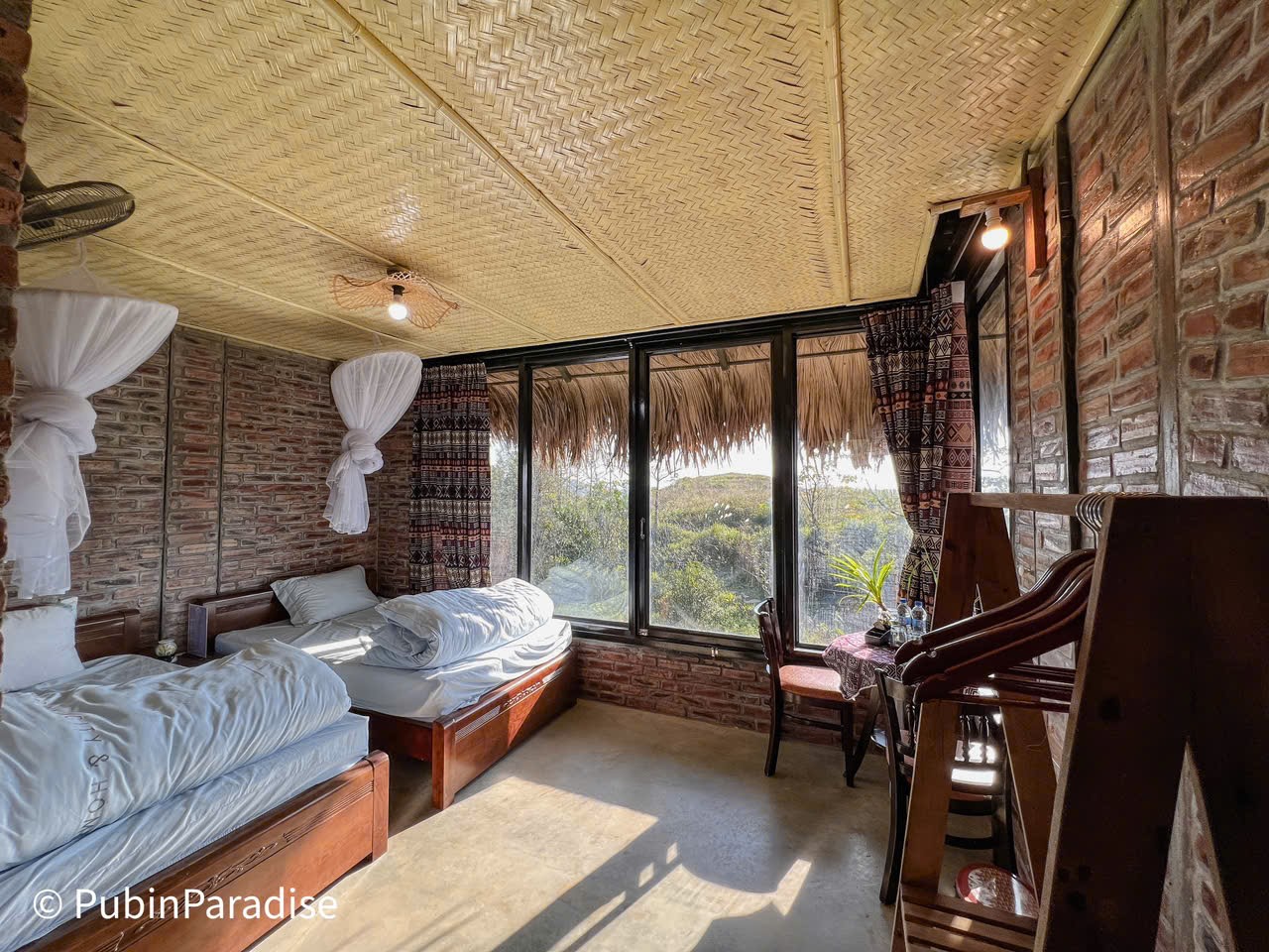 Phòng Twin Single tại PuBin Paradise Ecolodge được trang bị hai giường đơn rộng rãi, lý tưởng cho 2 người lớn và 1 trẻ em dưới 6 tuổi. Không gian phòng được bài trí tinh tế, kết hợp giữa phong cách hiện đại và nét mộc mạc của văn hóa địa phương.