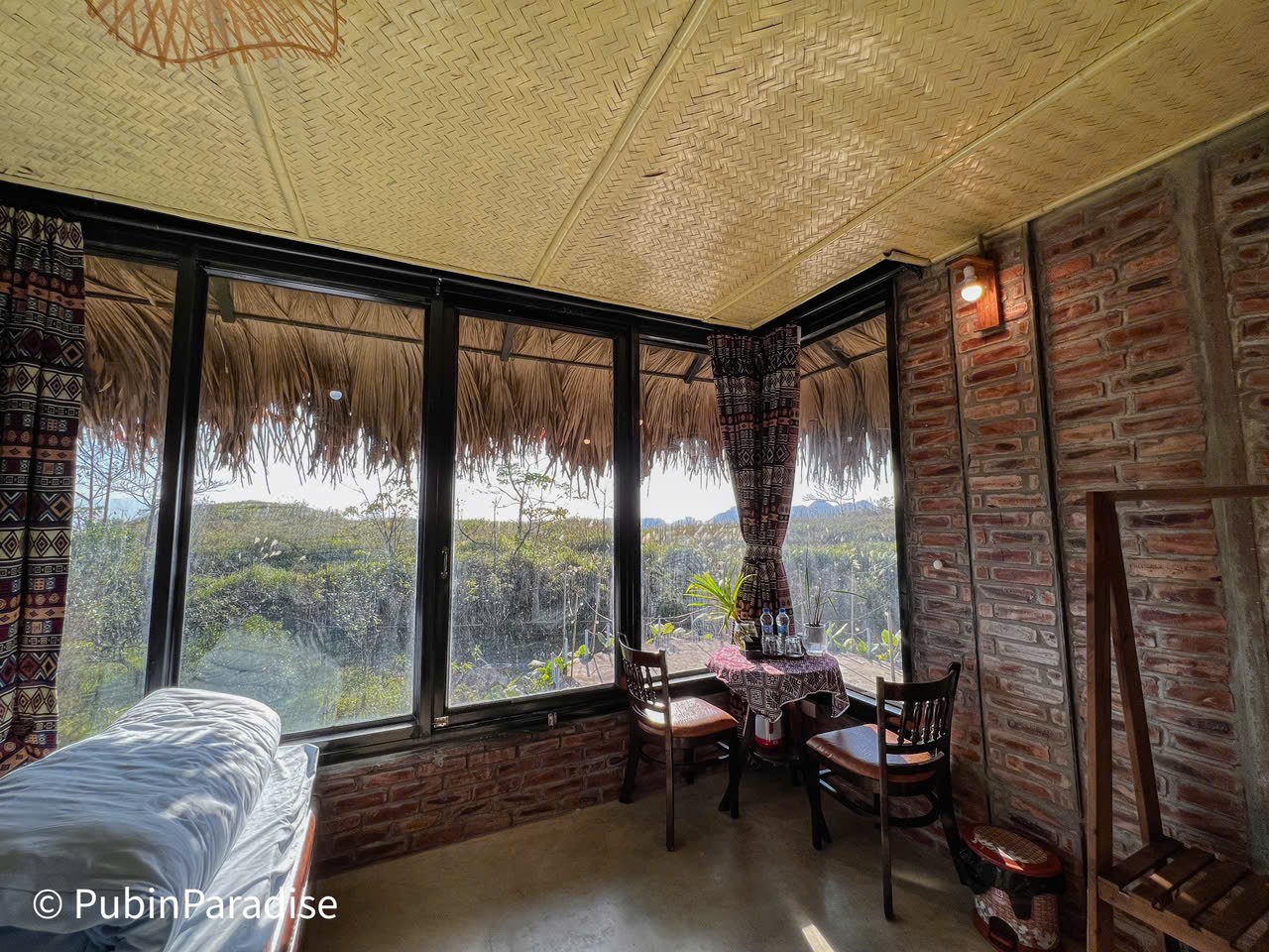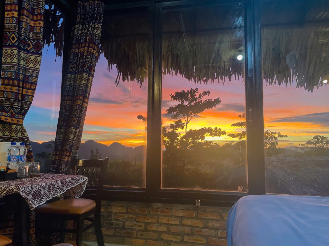 Từ phòng Twin Single, bạn có thể ngắm nhìn khung cảnh thiên nhiên tuyệt đẹp của Mai Châu. Ánh sáng mặt trời chiếu rọi qua cửa sổ, tạo nên những khoảnh khắc lãng mạn và bình yên. Đặc biệt, vào buổi chiều, khi hoàng hôn buông xuống, bạn sẽ được chiêm ngưỡng bức tranh thiên nhiên sống động với màu sắc rực rỡ, từ màu vàng ấm áp của ánh nắng đến màu xanh mát của núi rừng.
